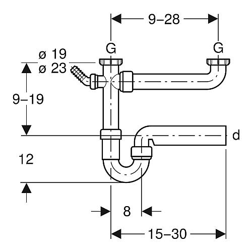 Verwendungszwecke - Zum Anschließen von Spültischen mit zwei Becken Eigenschaften - Güteüberwacht nach EN 274-3 - Mit Anschluss für Waschmaschine oder Geschirrspüler Lieferumfang - Einlaufstutzen mit Überwurfmutter aus PP, mit Zusatzanschluss - Winkelschlauchtülle aus PP, D 19 / 23 mm - Anschlussbogen mit Überwurfmutter - Blindkappe für Anschluss G 1"