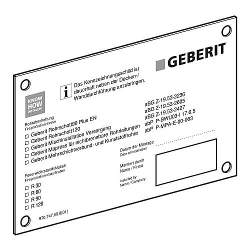 Verwendungszwecke - Zur vorgeschriebenen, dauerhaften Kennzeichnung der Rohrabschottung (R 30, R 60 und R 90) "Geberit Rohrschott90 Plus EN", gemäß aBG Nr, Z-19,53-2236 - Zur vorgeschriebenen, dauerhaften Kennzeichnung der Rohrabschottung (R 30, R 60, R 90 und R 120) "Geberit Rohrschott120", gemäß abZ Nr, Z-19,17-1807 - Zur vorgeschriebenen, dauerhaften Kennzeichnung der Rohrabschottung (R 30, R 60, R 90 und R 120) "Geberit Mischinstallation Versorgung", gemäß aBG Nr, Z-19,53-2427 - Zur vorgeschriebenen, dauerhaften Kennzeichnung der Rohrabschottung (R 30, R 60 und R 90) "Geberit Mapress für nicht brennbare Rohrleitungen", gemäß abP P-BWU03-I 17,6,5 - Zur vorgeschriebenen, dauerhaften Kennzeichnung der Rohrabschottung (R 30, R 60, R 90 und R 120) "Geberit Mehrschichtverbund- und Kunststoffrohre", gemäß abP P-MPA-E-00-063 Technische Eigenschaften